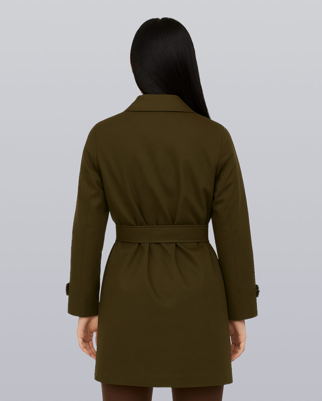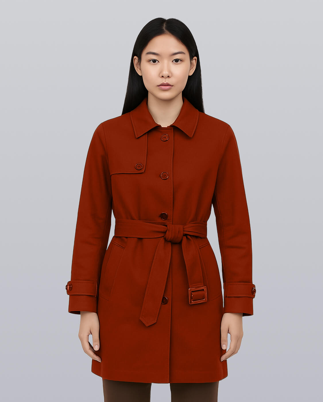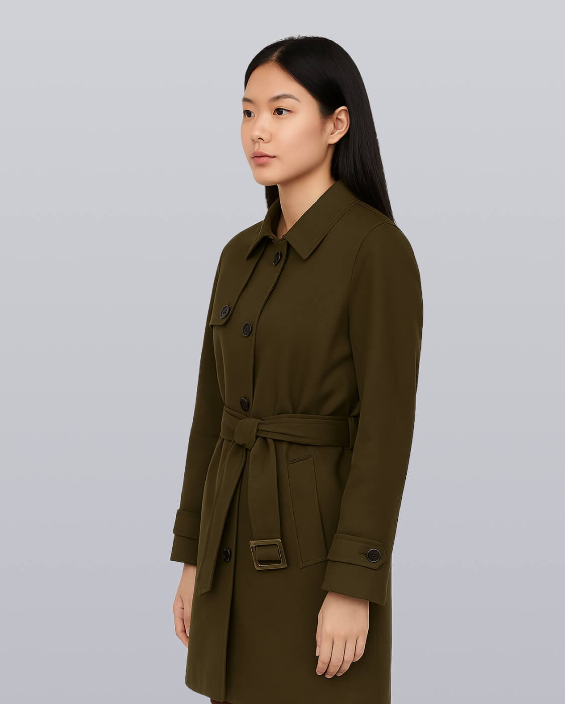 This belted trench coat combines timeless design with functional elegance. Crafted to provide a tailored fit, it features a classic double-breasted front and a waist belt that enhances silhouette definition. Ideal for transitional weather, the coat offers both style and practicality, making it a versatile addition to any wardrobe. Its structured cut and durable fabric ensure lasting wear and refined appeal.