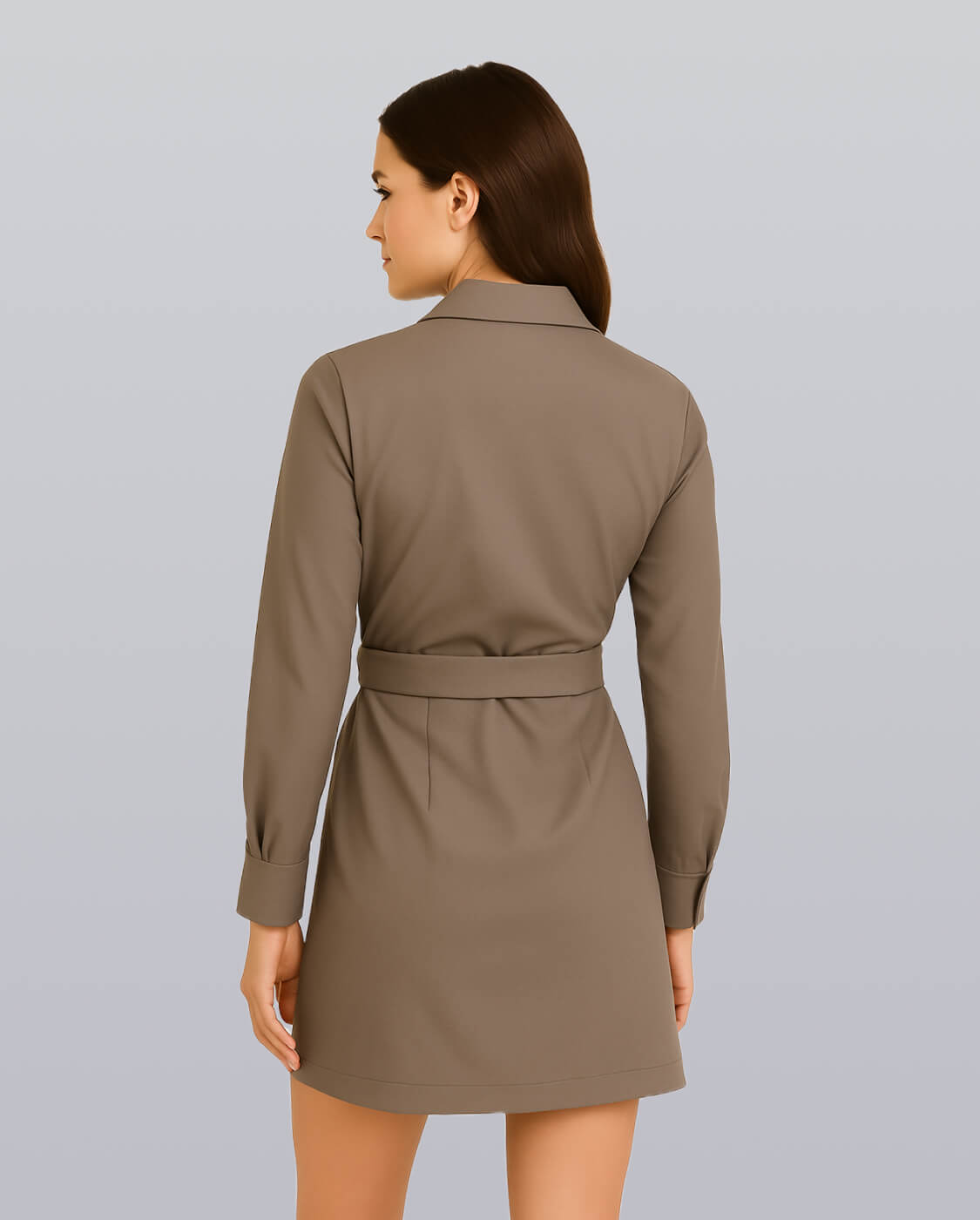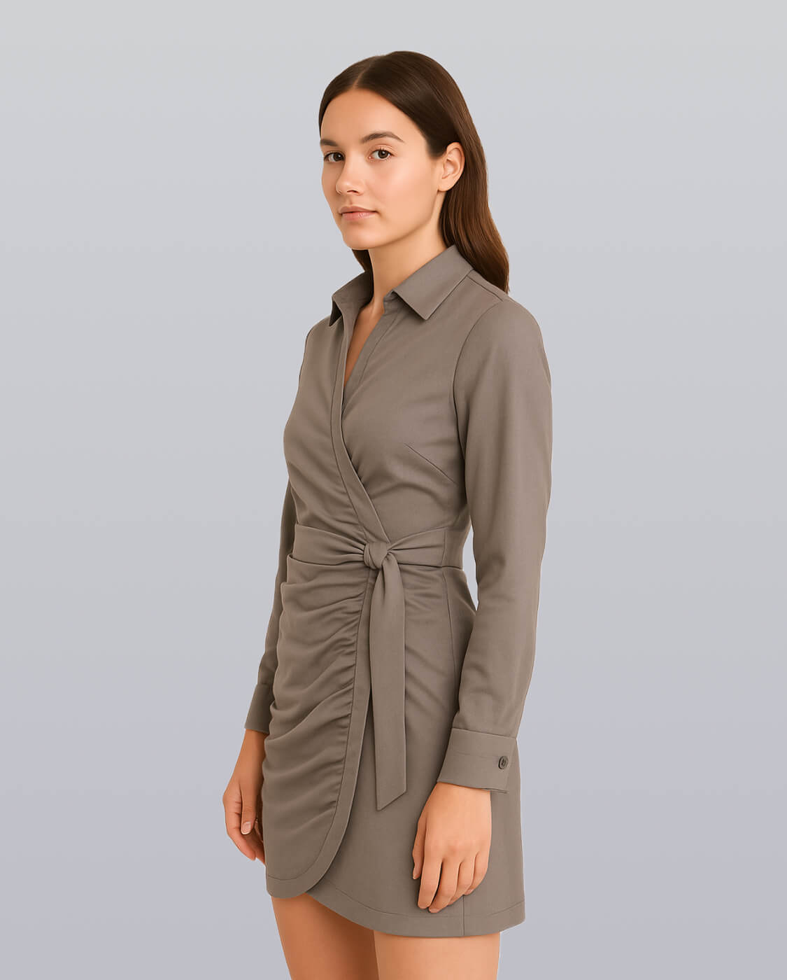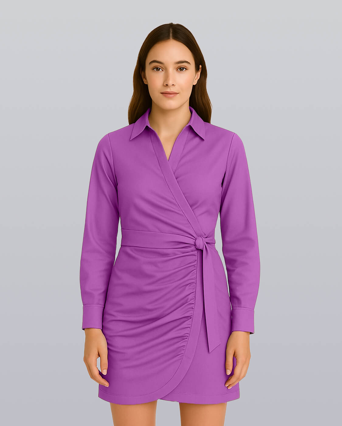 The Wrap Shirt Dress combines classic tailoring with effortless style, featuring a flattering wrap design that cinches at the waist for a customizable fit. Crafted from breathable fabric, it offers comfort and ease of movement, making it ideal for both professional settings and casual outings. Its versatile silhouette enhances any wardrobe with a polished, expert look.